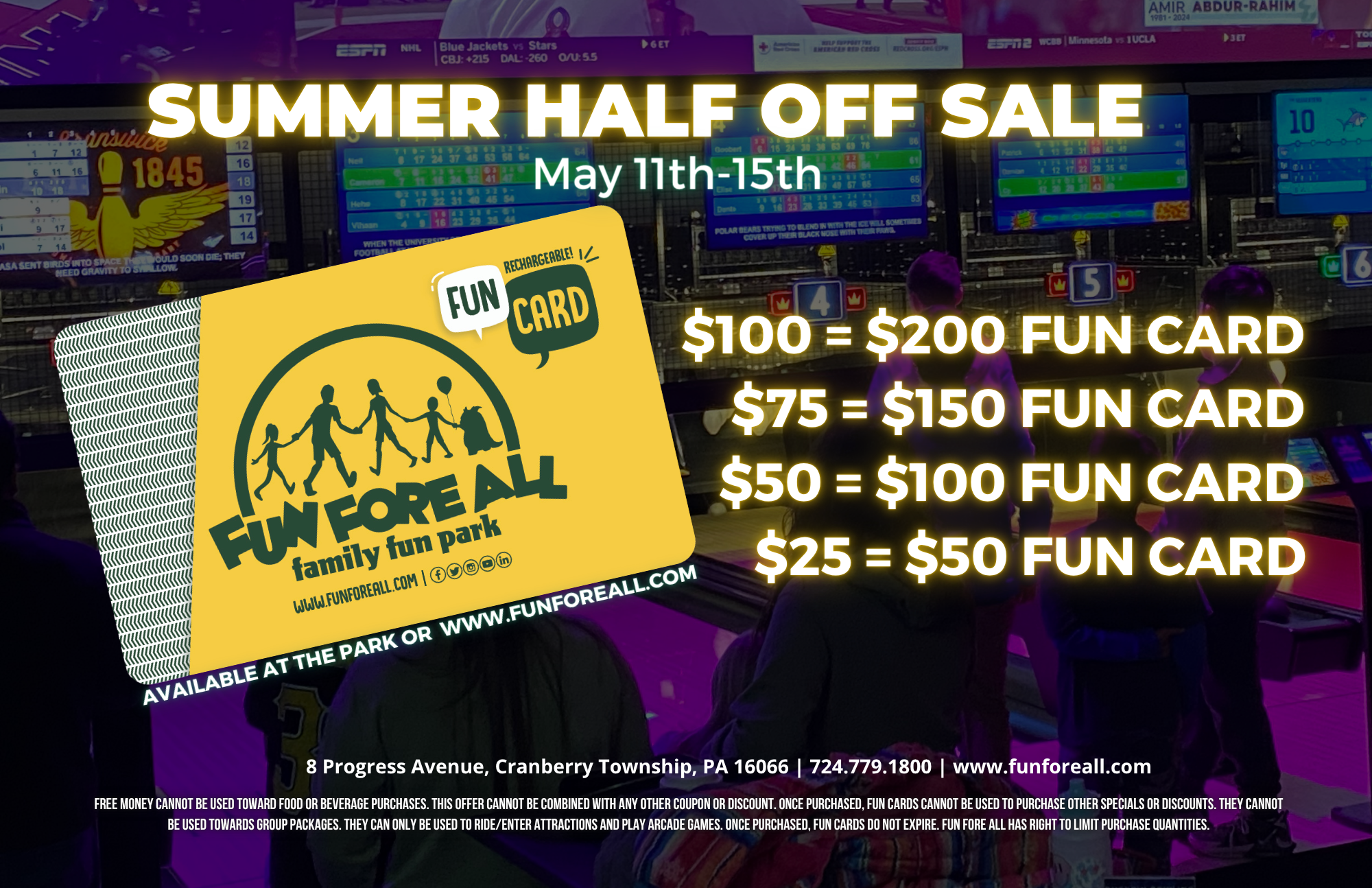 *Available Monday, May 11th, 2026 through Friday, May 15th, 2026 from 12pm to 9pm in-store or ALL DAY online! Free money cannot be used toward food or beverage purchases. This offer cannot be combined with any other coupon or discount. They cannot be used to purchase fun cards such as: Time Play Passes and/or Bonus Play Cards. Once purchased, Fun Cards cannot be used to purchase other specials or discounts. They cannot be used towards group or birthday party packages. They can only be used to ride/enter attractions and play arcade games. Once purchased, Fun Cards do not expire. Fun Fore All has right to limit purchase quantities.